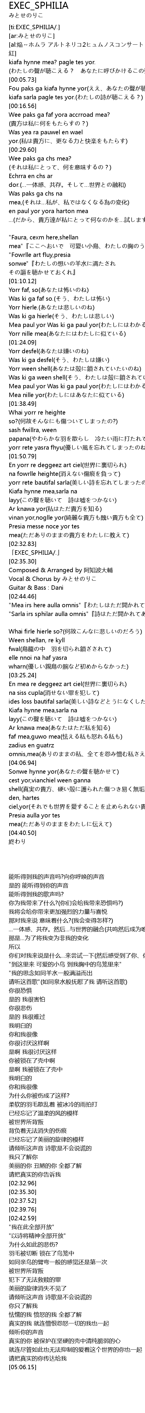 | [00:56.89] | "Fowrlle art fluy,presia sonwe"『わたしの想いの羊水に満たされ その謳を聴かせておくれ』 |