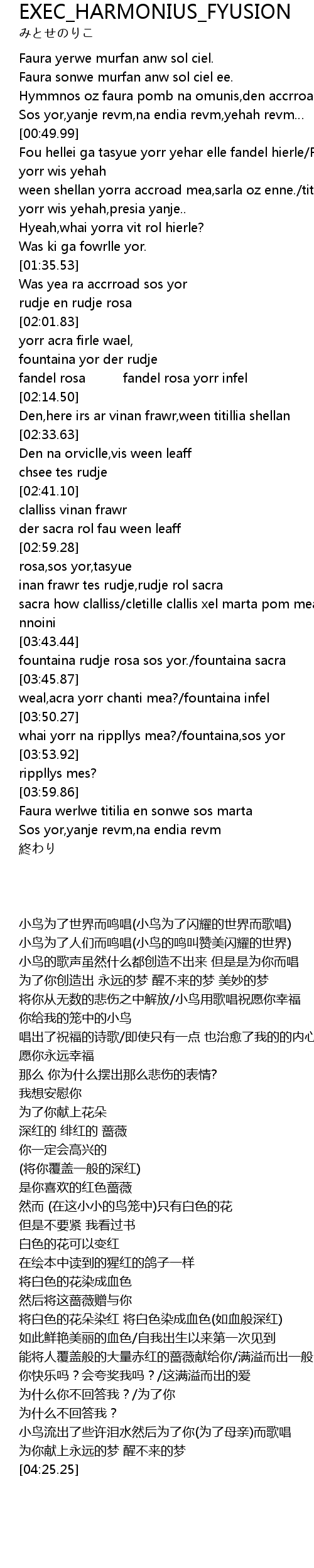 | [00:54.47] | Fou hellei ga tasyue yorr yehar elle fandel hierle/Faura sonwe presia yorr wis yehah |