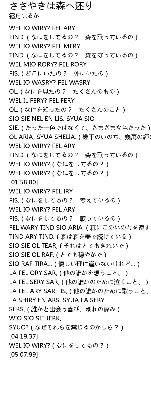 | [03:02.12] | FEL WARY TIND SIO ARIA.(森にこのいのちを還すことで) |