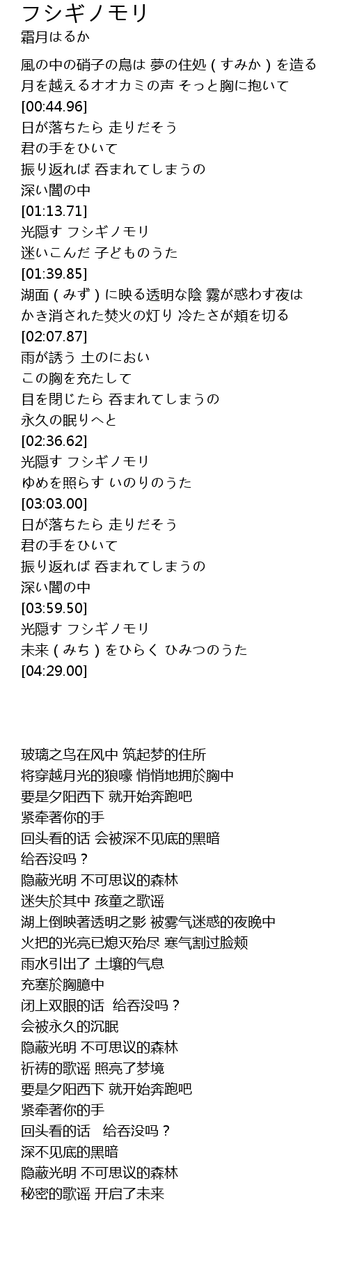 | [01:39.85] | 湖面(みず)に映る透明な陰 霧が惑わす夜は |