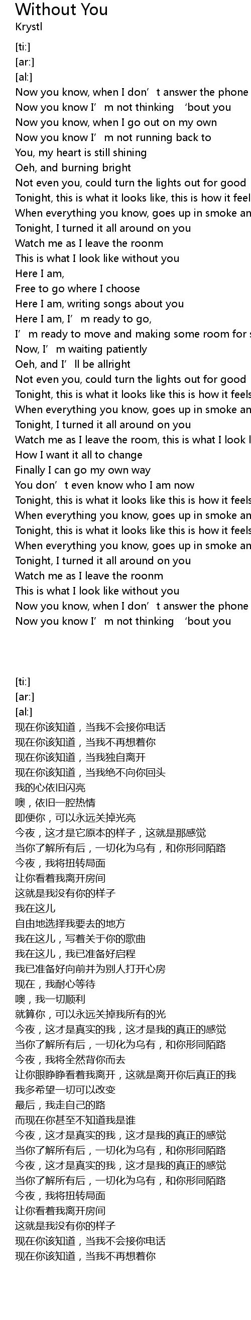 | [02:07.81] | Watch me as I leave the room, this is what I look like without you |