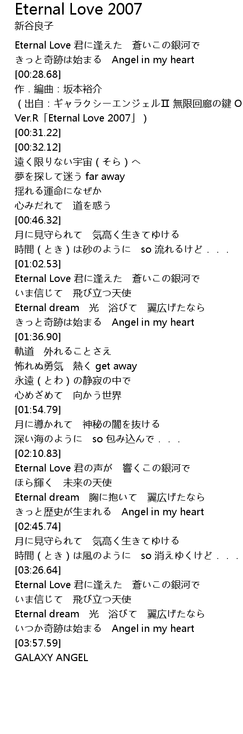 | [00:30.68] | (出自:ギャラクシーエンジェルⅡ 無限回廊の鍵 OP Ver.R「Eternal Love 2007」) |