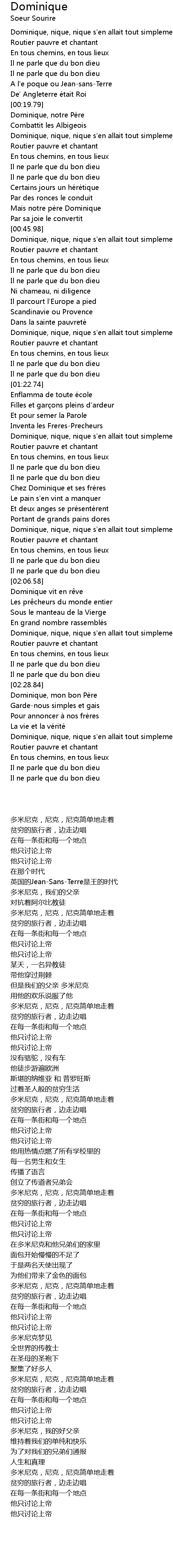 | [01:08.92] | Dominique, nique, nique s'en allait tout simplement |