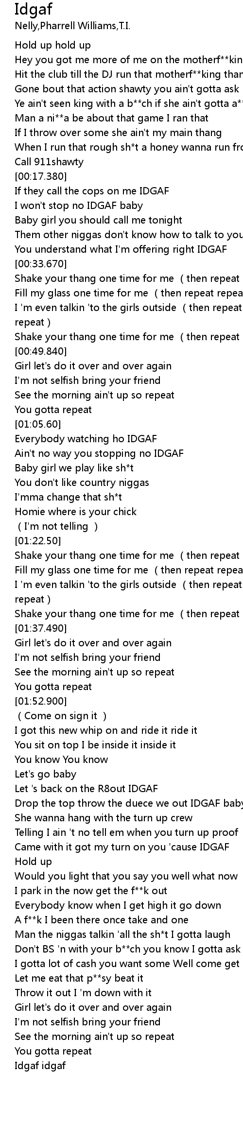 | [02:22.500] | Came with it got my turn on you ' cause IDGAF |