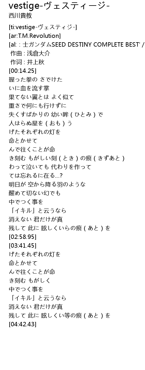 | [02:43.44] | 残して 此に 眩しくいらの痕(あと)を |