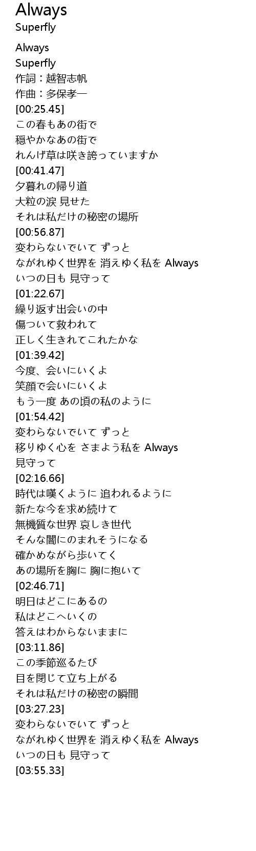 | [02:01.61] | 移りゆく心を さまよう私を Always |