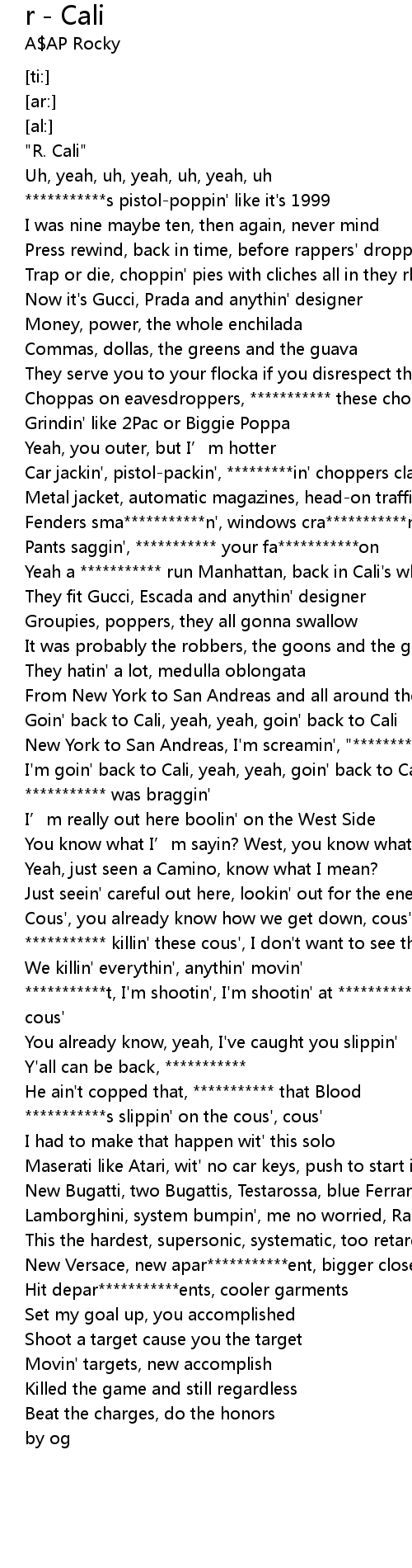 | [00:53.92] | Yeah a *********** run Manhattan, back in Cali's where it happen |