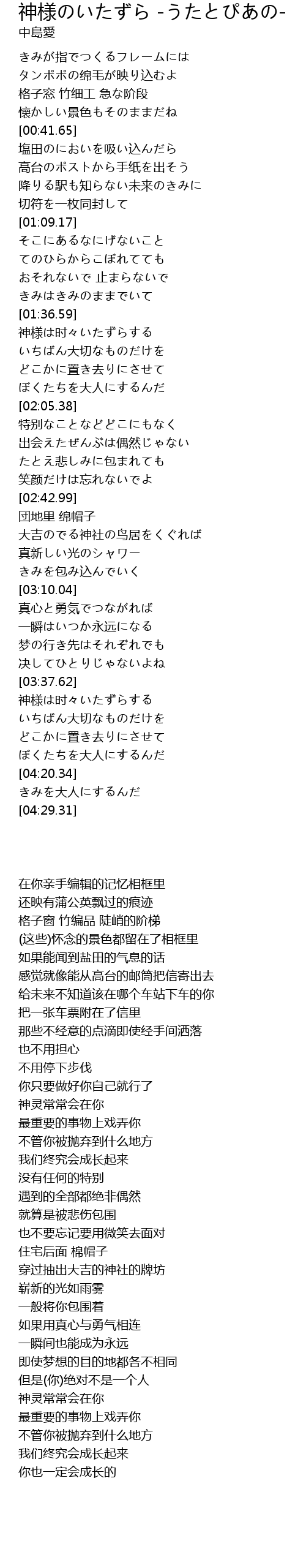 | [02:47.60] | 大吉のでる神社の鸟居をくぐれば |