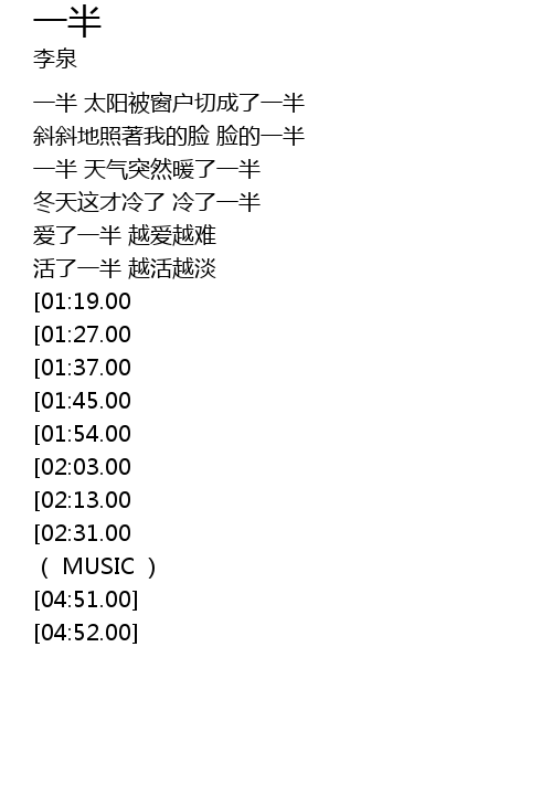 | [03:24.00][01:19.00] | 一半 心里正好暗了一半 |