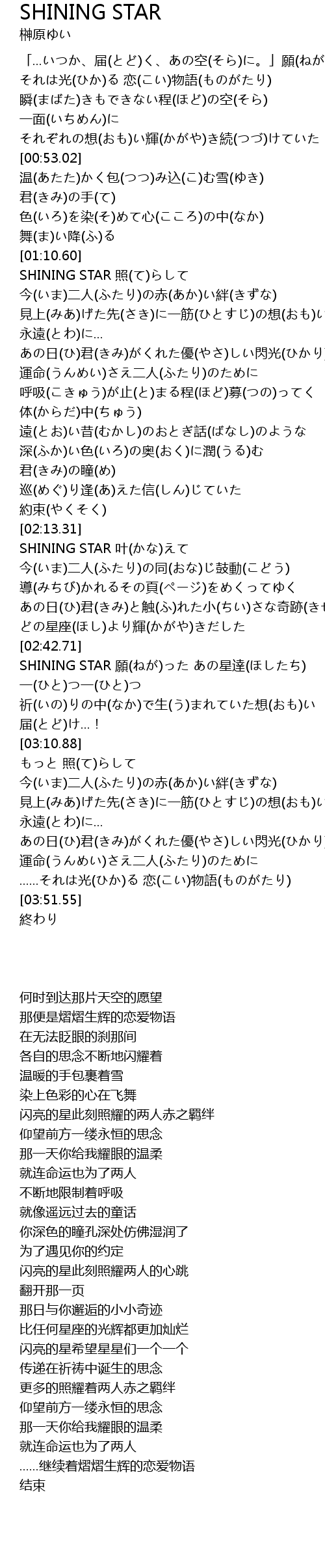 | [02:57.13] | SHINING STAR 願(ねが)った あの星達(ほしたち) 一(ひと)つ一(ひと)つ |