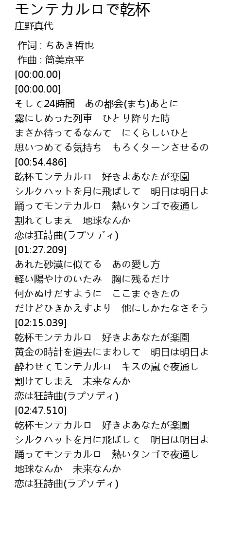 | [00:56.364] | 乾杯モンテカルロ 好きよあなたが楽園 |