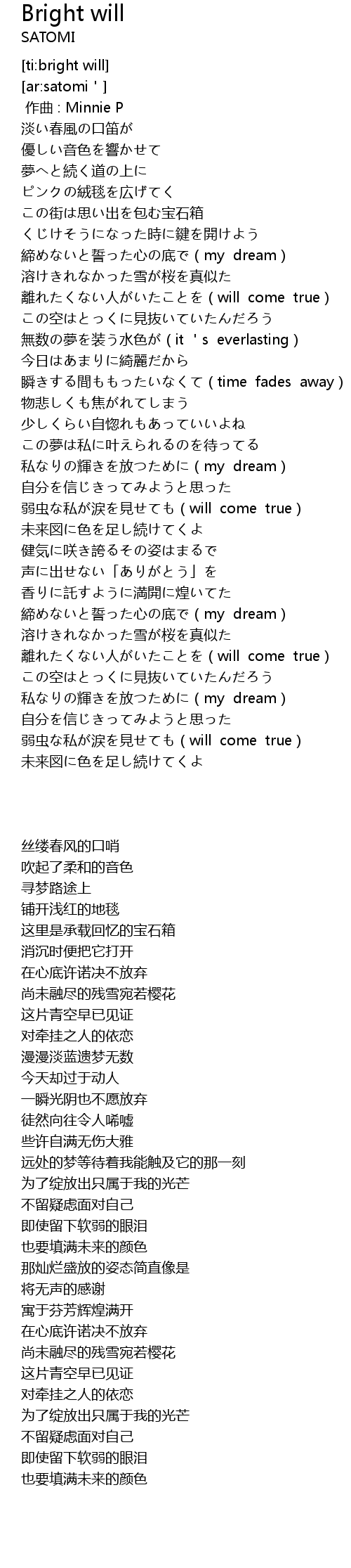 | [03:23.230] | 弱虫な私が涙を見せても(will come true) |