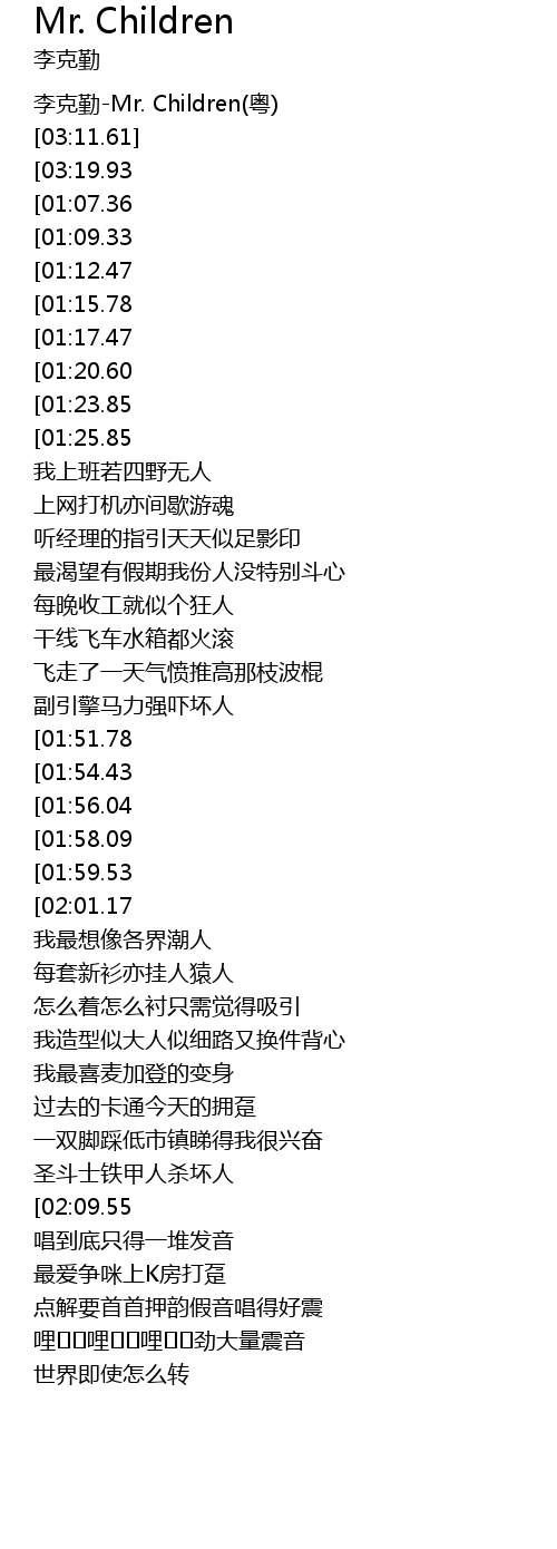 [00:00.73] 李克勤-Mr. Children(粤)