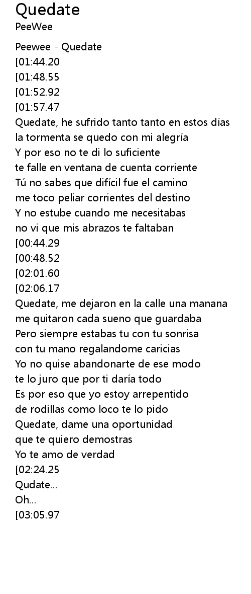 | [02:45.21][02:01.60][01:09.20] | Quedate (Quedate), por favor (por favor) |