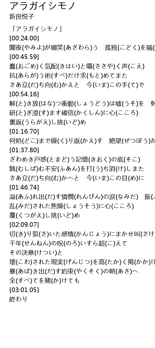 | [02:01.99] | 覆(くつがえ)し挑(いど)め |