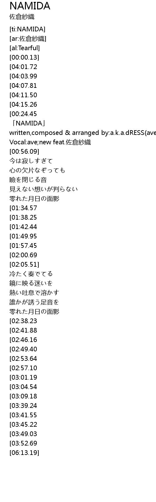 | [05:56.60][04:07.81][00:07.82] | NAMIDA |