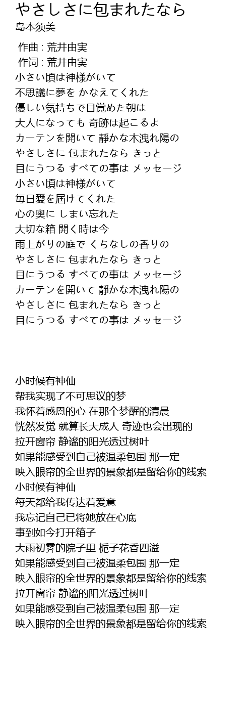 | [01:12.79] | やさしさに 包まれたなら きっと |