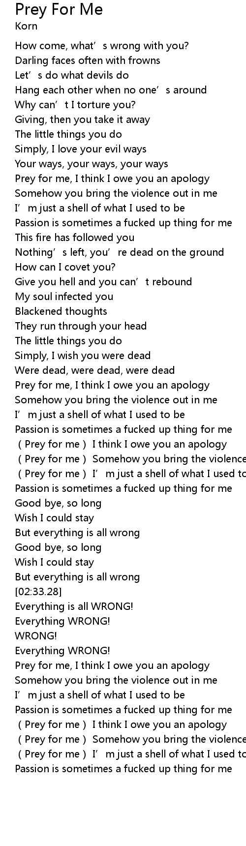 | [01:57.88] | Prey for me Somehow you bring the violence out in me |