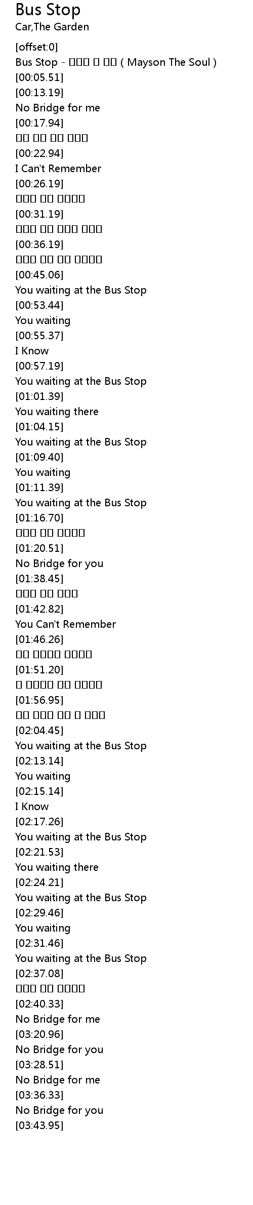 | [00:00.57] | Bus Stop - 메이슨 더 소울(Mayson The Soul) |