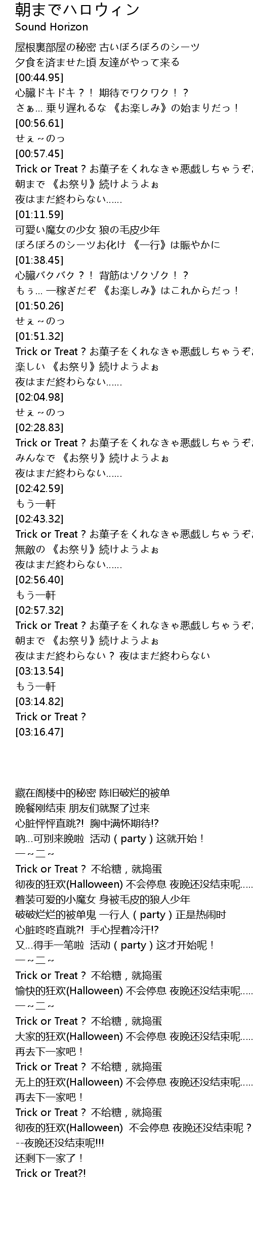| [03:03.39] | 彻夜的狂欢(Halloween) 不会停息 夜晚还没结束呢? --夜晚还没结束呢!!! |