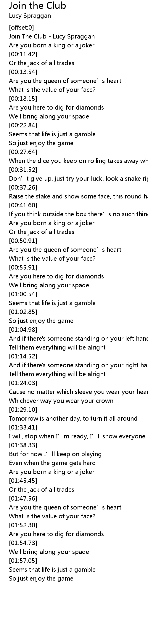 | [00:00.38] | Join The Club Lucy Spraggan |