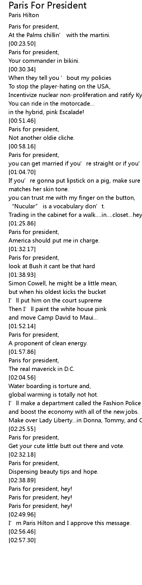 | [02:53.95] | I’m Paris Hilton and I approve this message. |