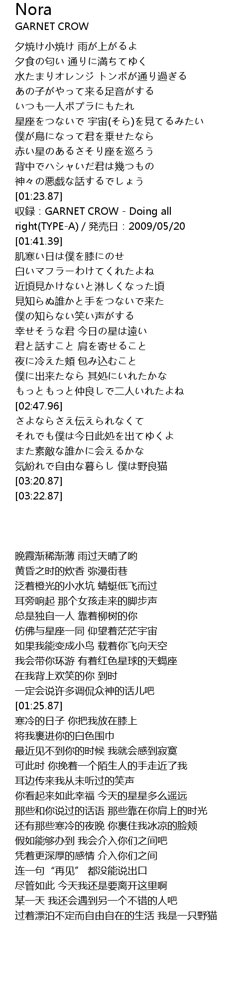 | [01:25.87] | 収録:GARNET CROW - Doing all right(TYPE-A)/発売日:2009/05/20 |