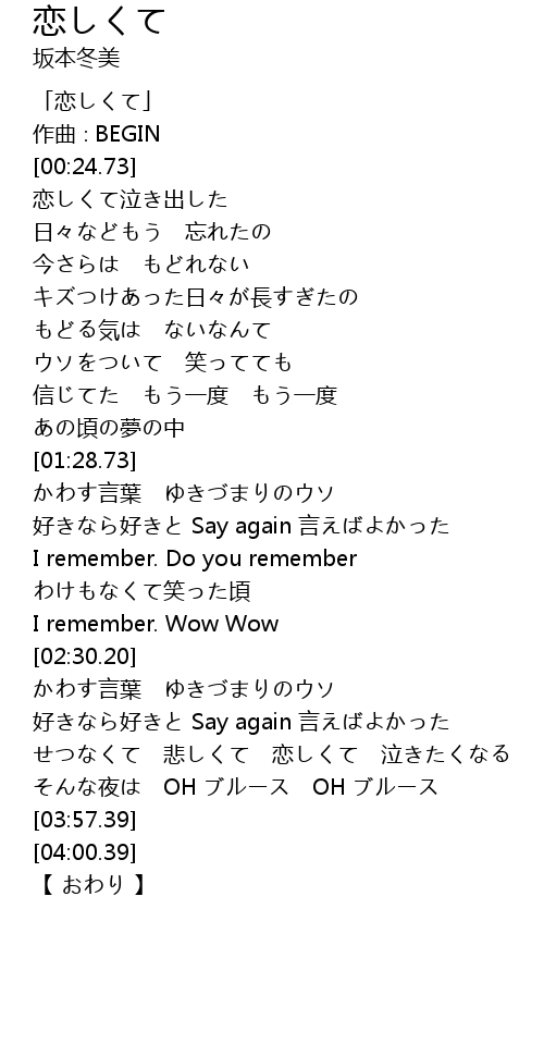 | [03:33.19] | せつなくて 悲しくて 恋しくて 泣きたくなる |