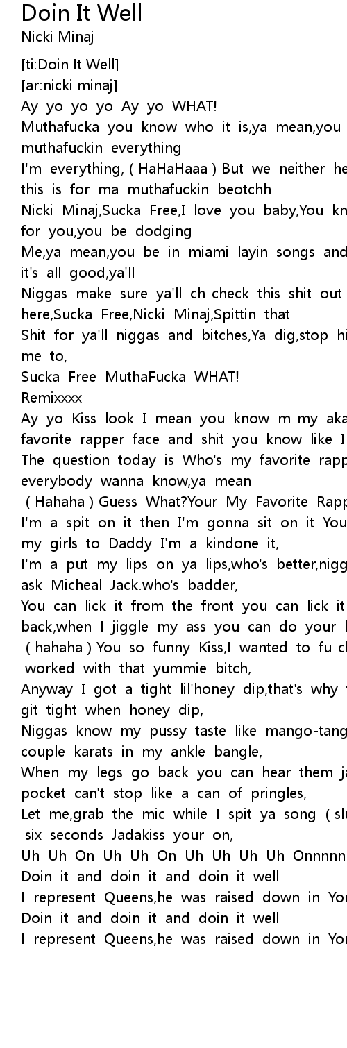 | [00:31.805] | Niggas make sure ya' ll chcheck this shit out right here, Sucka Free, Nicki Minaj, Spittin that |