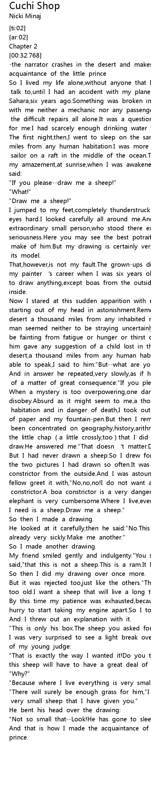 | [00:38.58] | "If you please--draw me a sheep!" |