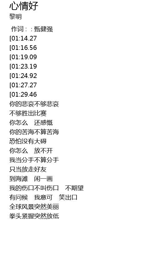 | [02:33.80][01:19.09][00:23.18] | 心情好 可会伴我漫步 |