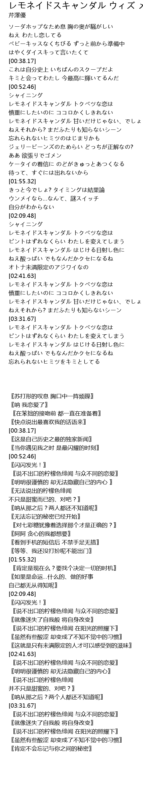 | [03:19.60] | 〖说不出口的柠檬色绯闻 并不只是甜蜜的、对吧?〗 |