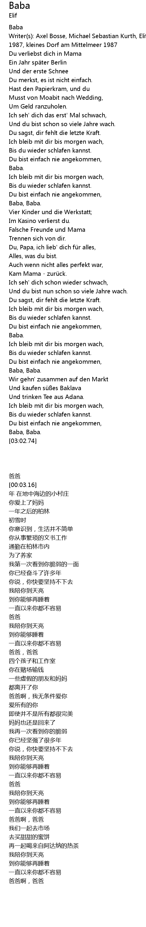 | [00:03.16] | Writer s: Axel Bosse, Michael Sebastian Kurth, Elif Demirezer |