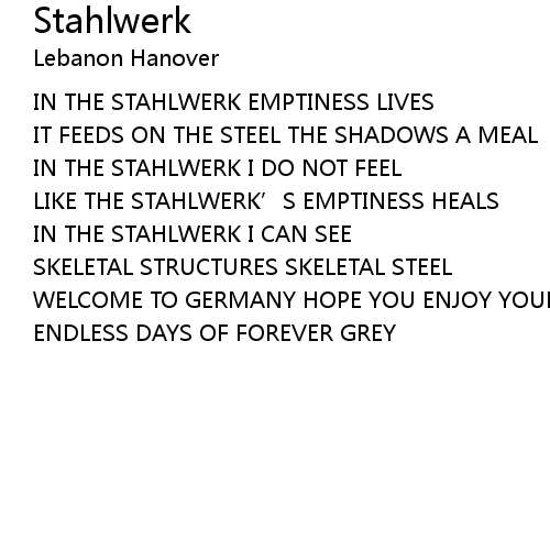 | IN THE STAHLWERK EMPTINESS LIVES | |