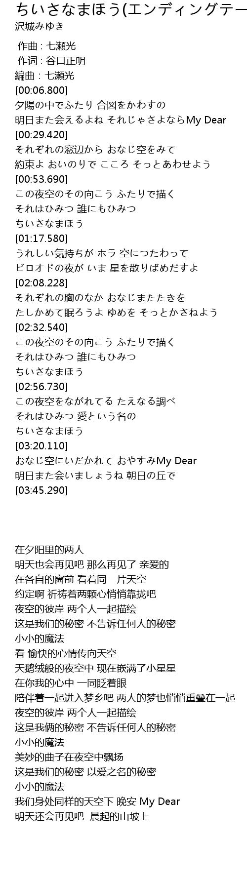 | [00:43.280] | 約束よ おいのりで こころ そっとあわせよう |