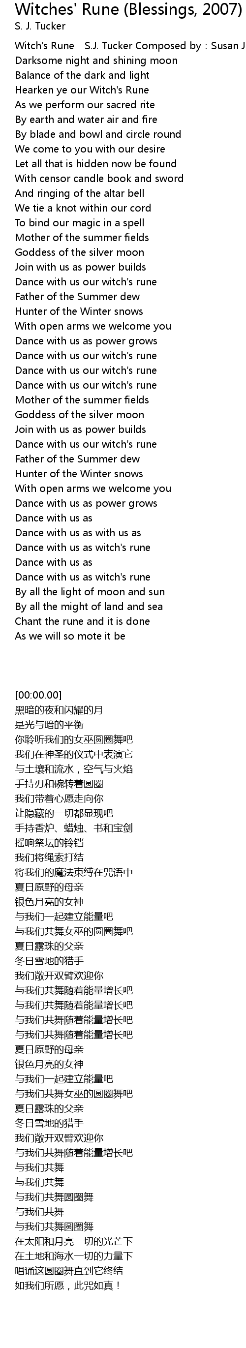 | [00:00.00] | Witch's Rune - S.J. Tucker Composed by:Susan Jane Tucker |