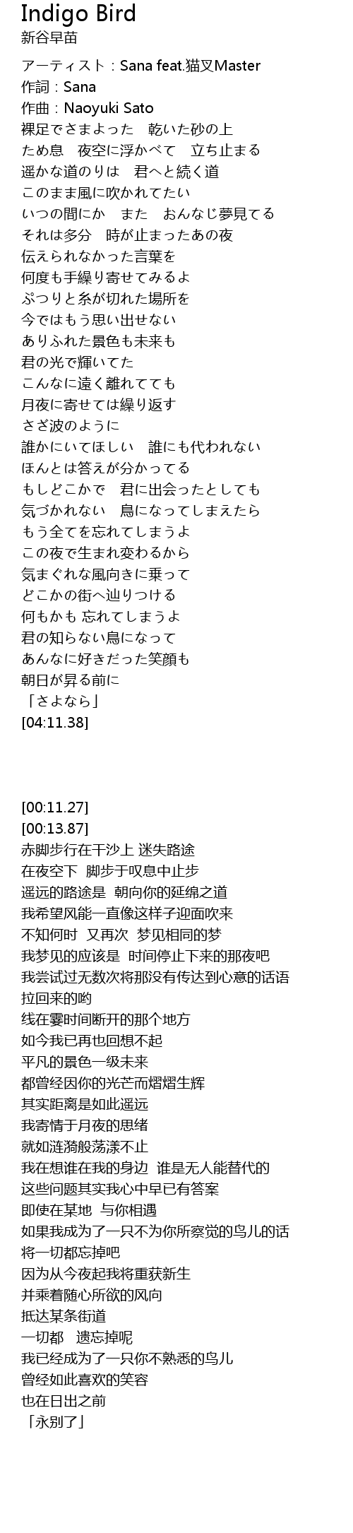 | [00:11.27] | アーティスト:Sana feat.猫叉Master |