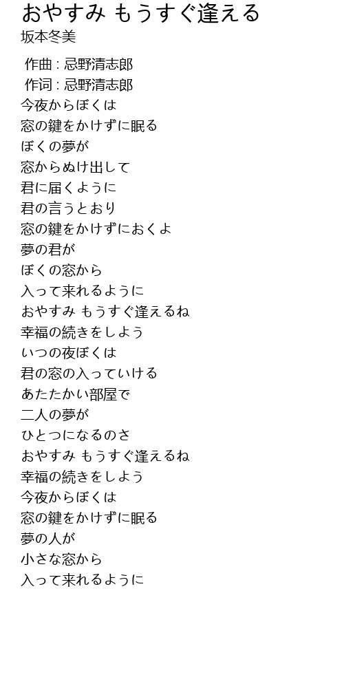 | [01:40.50] | おやすみ もうすぐ逢えるね |