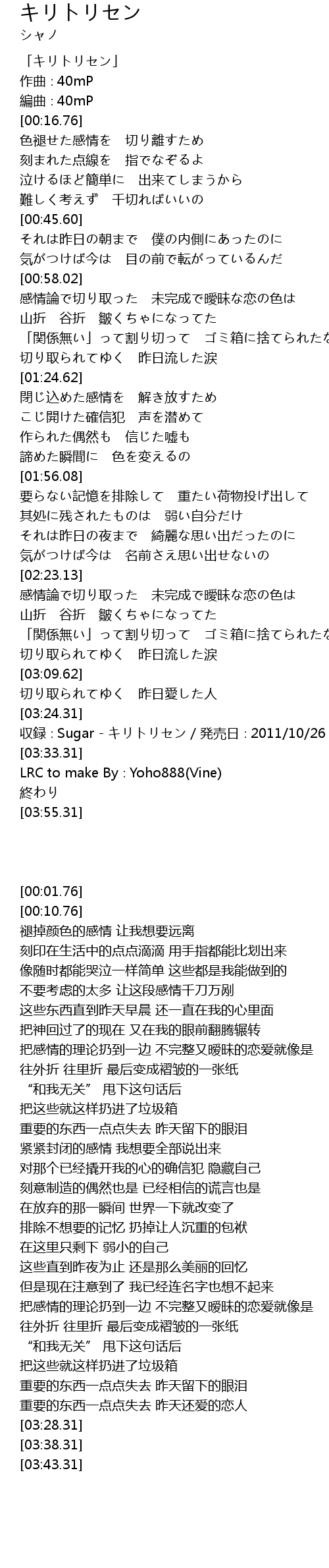 | [03:28.31] | 収録∶Sugar - キリトリセン/発売日∶2011/10/26 |