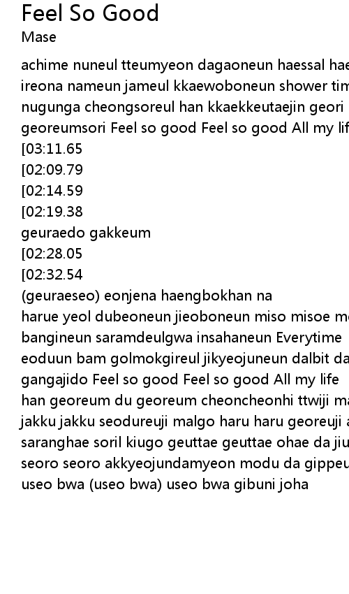nugunga cheongsoreul han kkaekkeutaejin geori georie ullineun nae georeumsori Feel so good Feel so good All my life |
