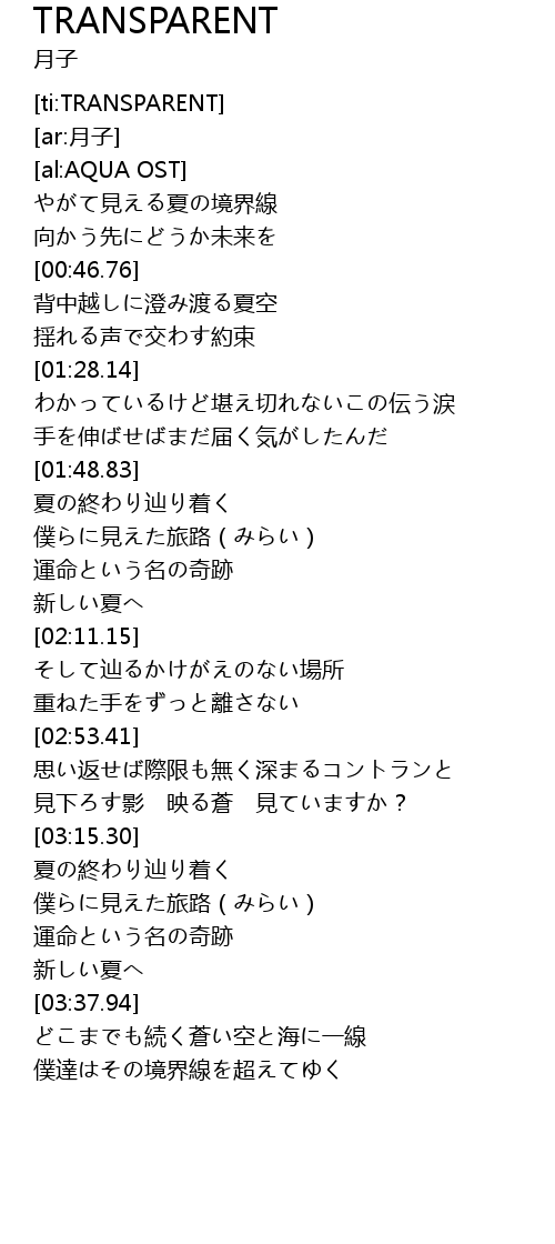 | [03:38.43] | どこまでも続く蒼い空と海に一線 |