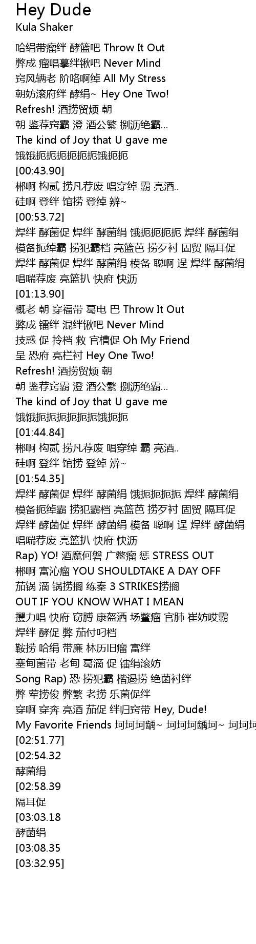 | [02:39.13] | 穿啊 穿奔 亮酒 茄促 绊归窍带 Hey, Dude! |