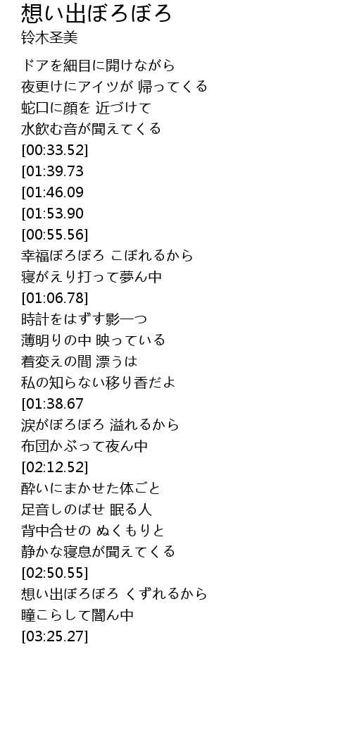 | [03:12.39] | 想い出ぼろぼろ くずれるから |