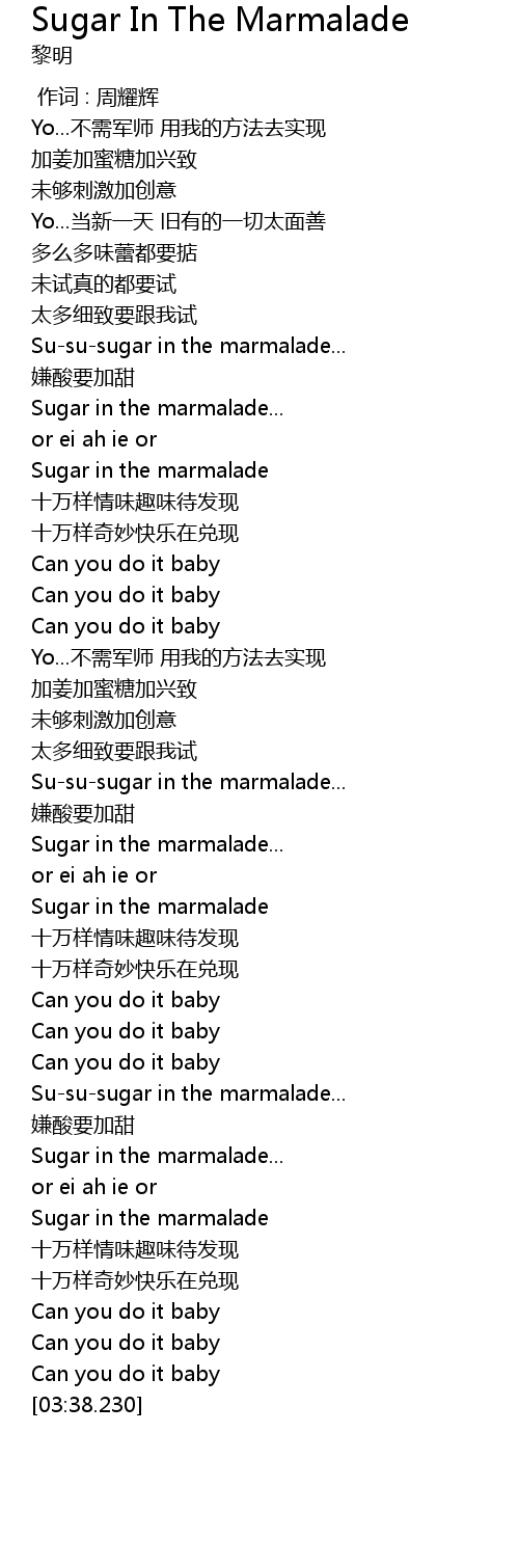 | [03:23.280] | Sugar in the marmalade |