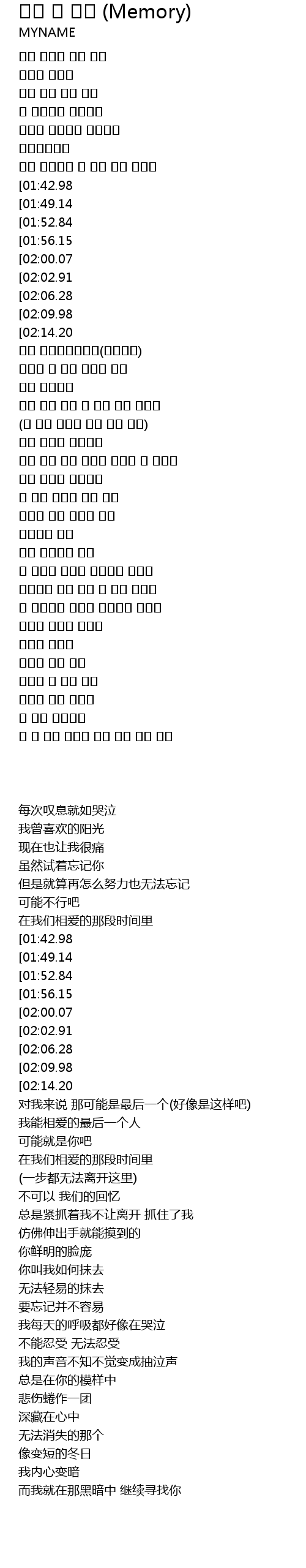 | [00:41.23][01:42.98] | 나는 혼자 이렇게 아직도 멈춰 있는데 |