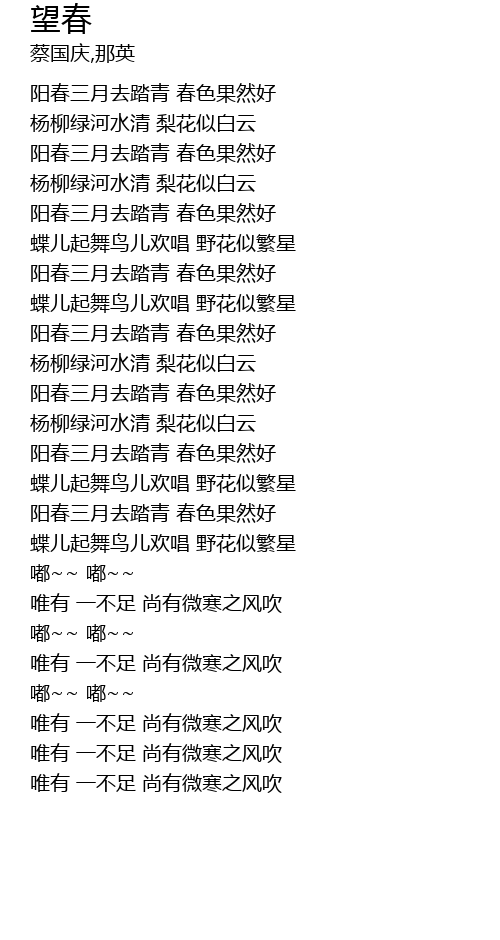 | [01:38.750] | 杨柳绿河水清 梨花似白云 |