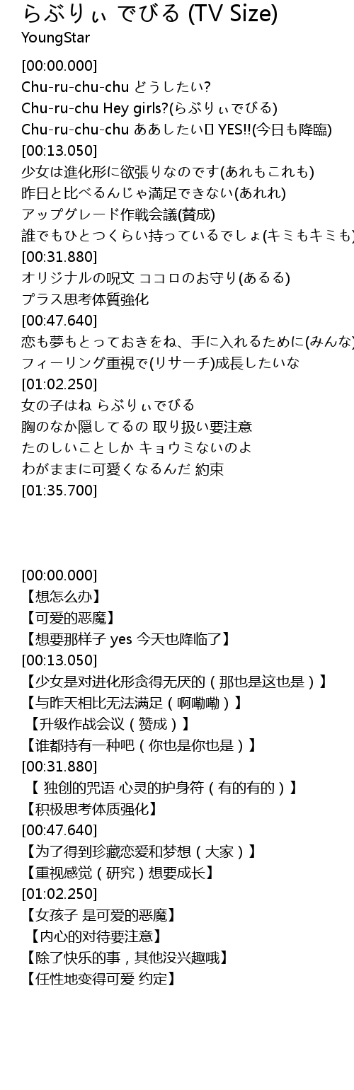 | [00:04.350] | Chu-ru-chu Hey girls?(らぶりぃでびる) |