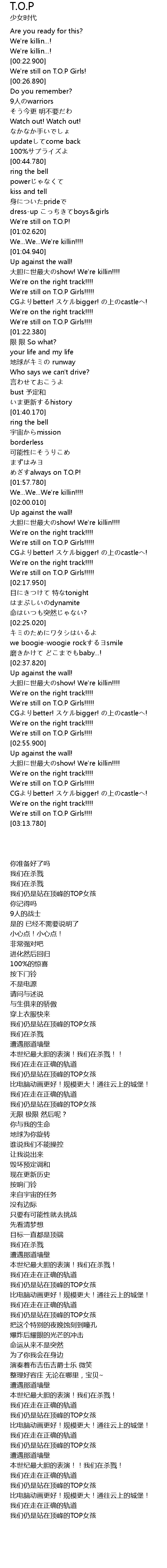 | [03:02.760] | We' re still on T. O. P Girls!!!!! |