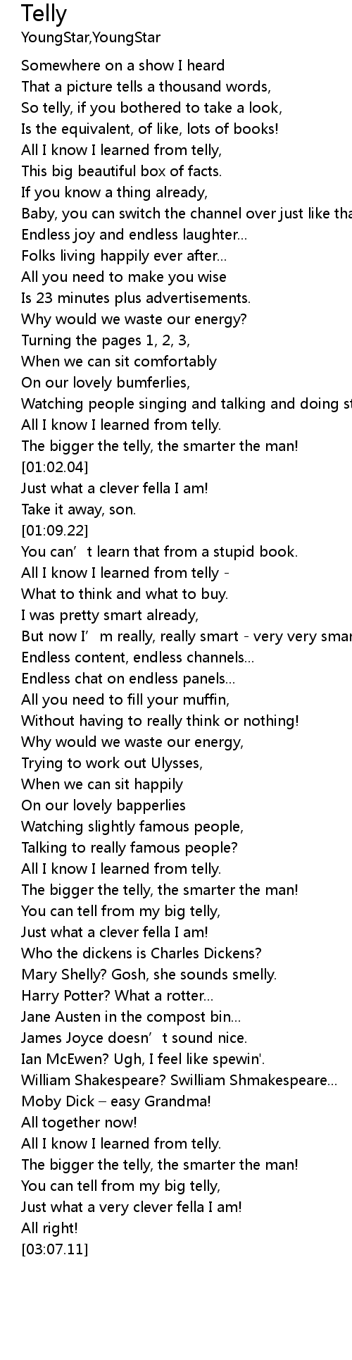 | [00:57.26] | All I know I learned from telly. |