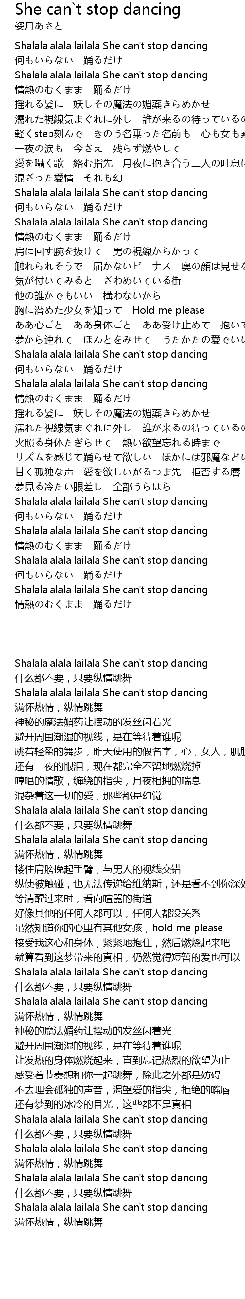 | [00:20.90] | Shalalalalala lailala She can't stop dancing |